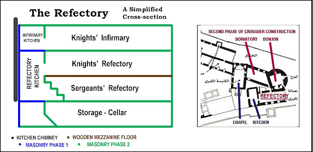 The large ground-floor, measuring 22.5 X 9 metres and lit by only one slit-window, was a storeroom for the refectory and, given its unique and almost metre-wide ventilation shafts, must have served as the main cellar from which wine barrels were brought up to the refectory ... The hall above, measuring 25.5 metres, was the main dining area of the citadel and was lit from the west by a double row of windows. This, combined with the series of corbels in the eastern and western sidewalls and the fact that the kitchen door opens halfway up the northern wall of the hall, makes it evident that the refectory was divided [horizontally] by a wooden mezzanine floor. The upper [part of the] hall, with its own stepped entrance from the neighbouring courtyard, might have served as the knight's refectory, and the lower one with its doorway also on the eastern side of the hall, as the dining hall of the sergeant brothers ... the top of [the refectory wing] remained unbuilt at this time and had only a crenellated parapet.